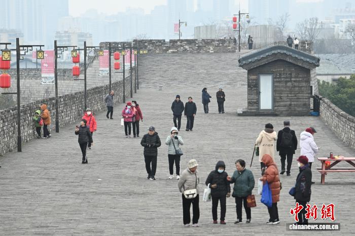 3月4日,江苏北京,市平易近登上有着600多年汗青的亮乡墙浏览景色。中新社记者 泱波 摄